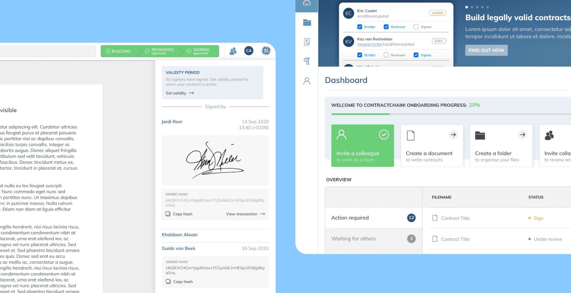 Our partnership with HODL proved to be a unique opportunity to apply the technical expertise of Lizard Global with which we created Contract Chain. Where HODL gave input from an HR perspective, we applied our knowledge of blockchain technology and smart contracts in order to create a user-friendly desktop environment for the secured handling of contracts within companies.