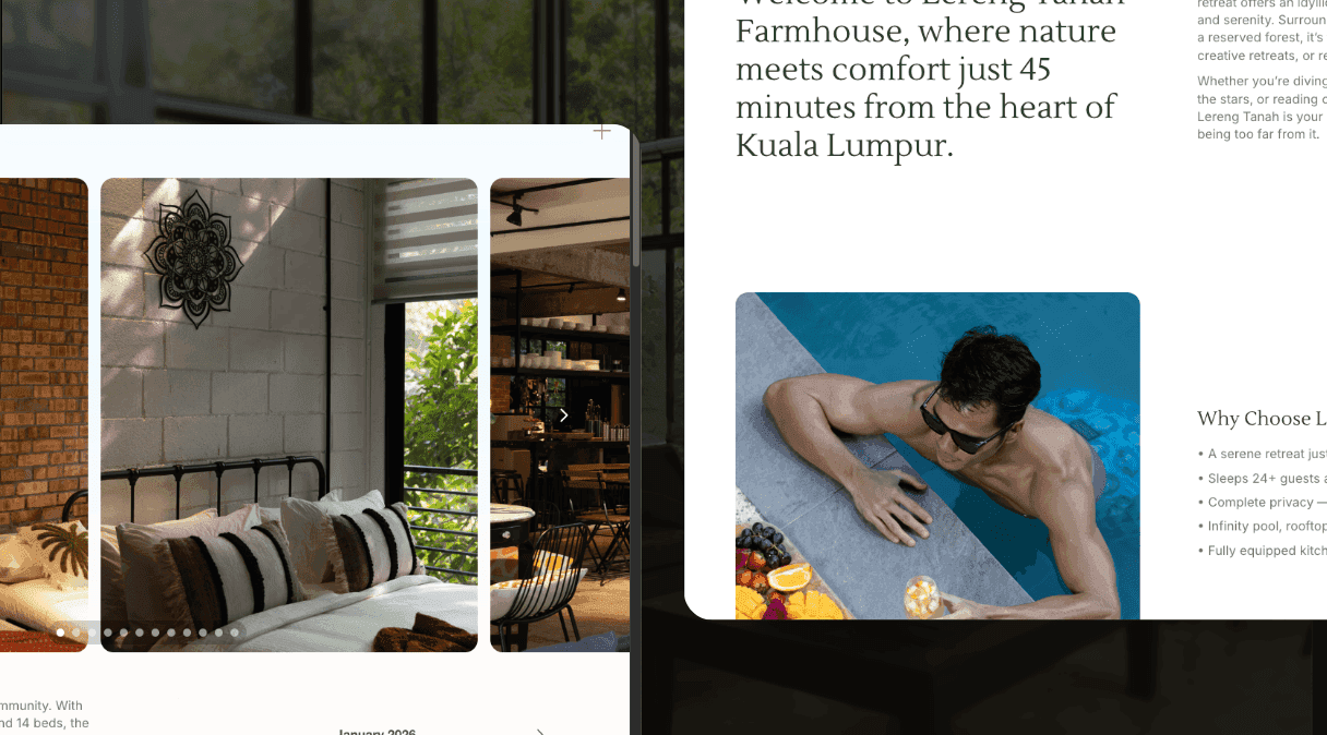 Thanks to its unique positioning and guest experience, Lereng Tanah consistently attracts strong demand and high booking volumes. While Airbnb played a key role in establishing visibility, our client envisioned a more independent, brand-owned digital presence that reflected the exclusivity of her property and gave her greater control over how bookings were managed.